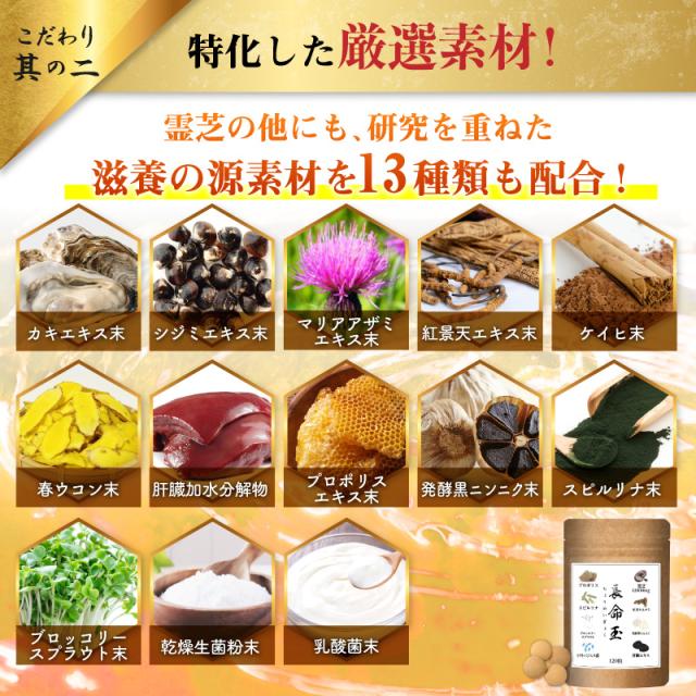 【原材料】霊芝粉末、還元麦芽糖水飴、カキエキス末、シジミエキス末、マリアアザミエキス末、紅景天エキス末、ケイヒ末、春ウコン末、肝臓加水分解物、プロポリスエキス末、発酵黒ニンニク末、スピルリナ末、ブロッコリースプラウト末、乾燥生菌粉末、乳酸菌末/セルロース、V.C、ステアリン酸Ca、微粒酸化ケイ素、HPC、L-グルタミン、コハク酸