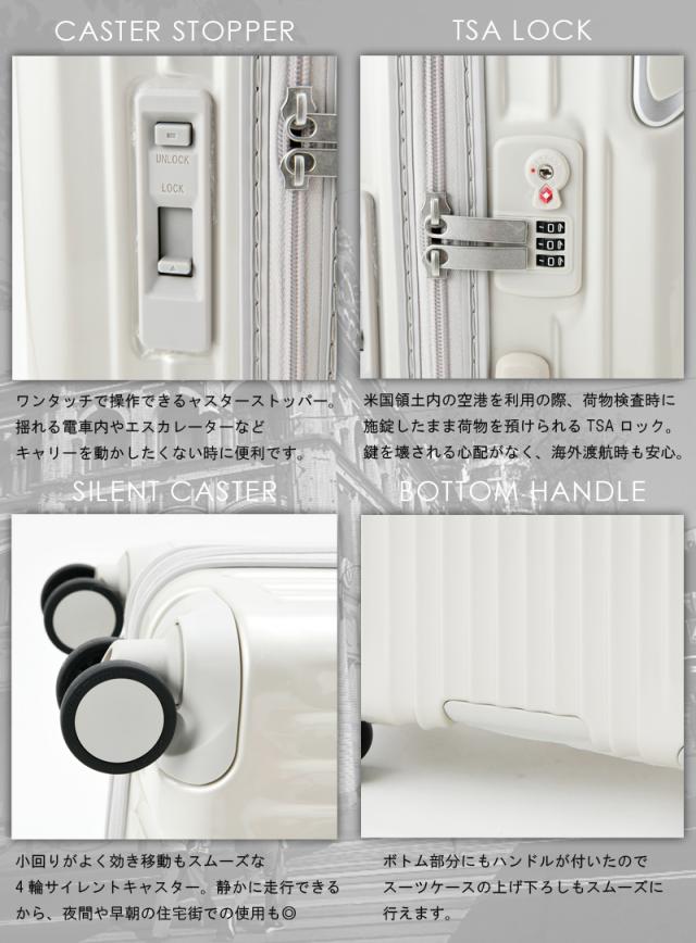 こちらは1泊-3泊程度の旅行にぴったりの機内持ち込み可能サイズ。サイレント4輪キャスターは小回りがきいて移動もラクラク。ボトム部分にもハンドルが追加され、スーツケースの上げ下ろしもスムーズです。
