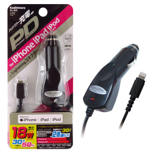 カシムラ 車用iPhone充電器 USB PD 高速充電対応 Power delivery Lightningコネクタ 12V/24V車対応 車載 iPad iPad touch KL-83
