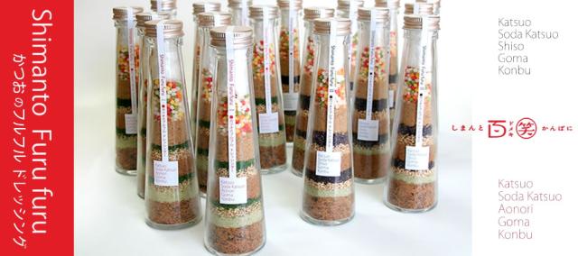 日本初!世界発!の鰹節や貴重な宗田鰹節の粉をベースに、昆布・煎り胡麻・ぶぶあられに青のりや梅しそが原材料の、すべて天然素材の、粉のドレッシングのことです。