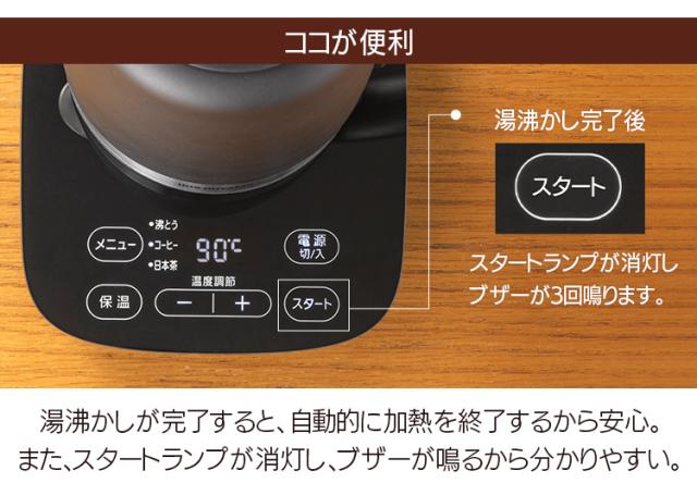 自動メニューボタン付きで、ボタンひとつでコーヒーやお茶に合った温度で沸かせます。