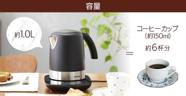コーヒーカップ約6杯分(1杯150ml)が沸かせる容量1000ml。