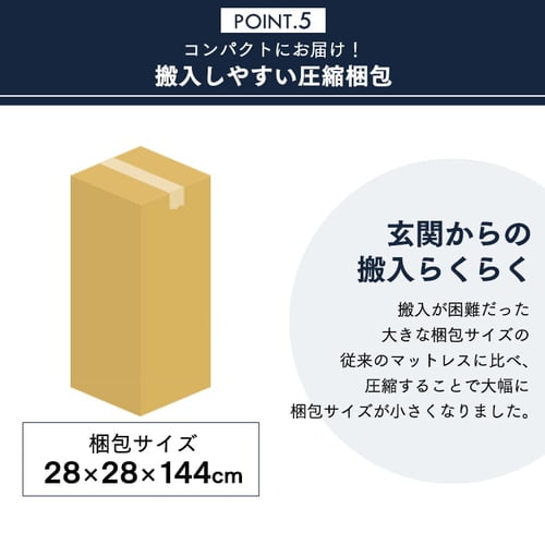 - 商品は重量はありますが、郵送時は圧縮されて来るので部屋まで持って行って開封できます。 寝心地は沈みこみがあるので私には柔らかいなと思いましたが、硬め以外希望の方にはかなりコスパが良い商品だと思います。(ニトリの同サイズ、レベルより安いです。)