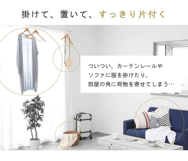 ついつい、カーテンレールやソファに服を掛けたり、角に寄せてしまう荷物を、「掛けて」「置いて」すっきり。