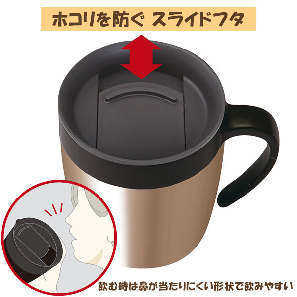 フタ付きスライドフタで飲み口が現れ、ホコリを防ぐデザインになっています。