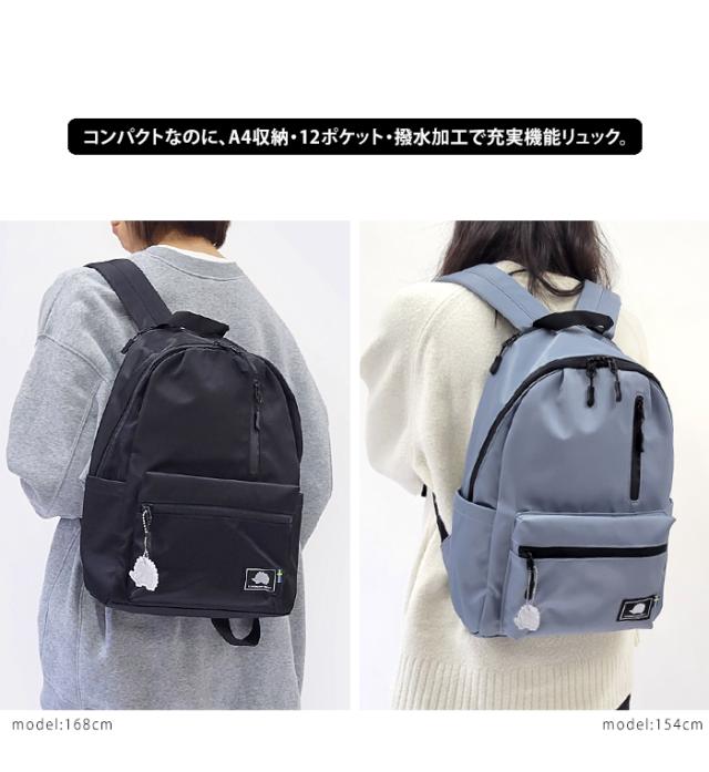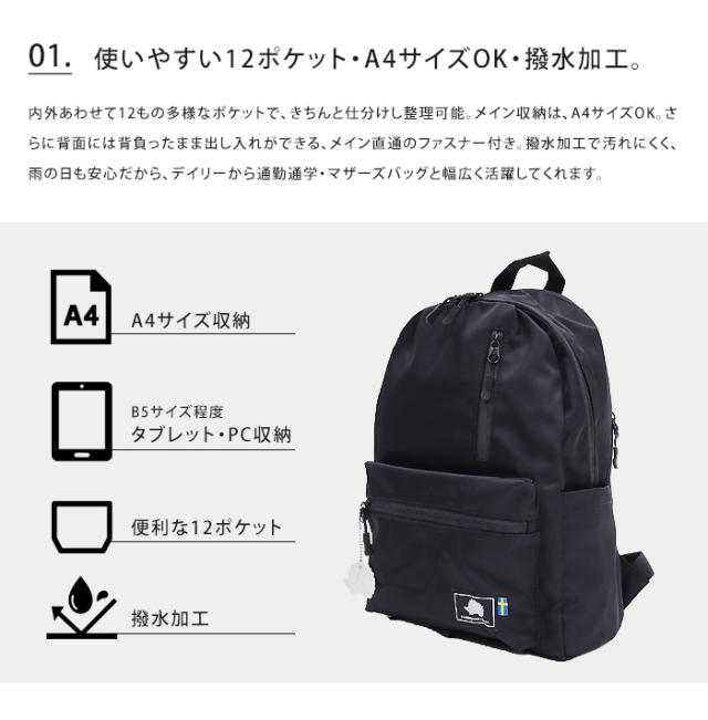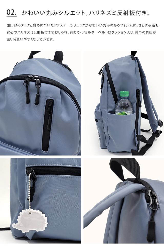 内外あわせて12もの多様なポケットで、きちんと仕分けし整理可能。メイン収納は、A4サイズOK。さらに背面には背負ったまま出し入れができる、メイン直通のファスナー付き。撥水加工で汚れにくく、雨の日も安心だから、デイリーから通勤通学・マザーズバッグと幅広く活躍してくれます。開口部のタックと斜めについたファスナーでリュックがかわいい丸みのあるフォルムに。さらに夜道も安心のハリネズミ反射板付きでおしゃれ。背あて・ショルダーベルトはクッション入り。肩への負担が減り背負いやすくなっています。