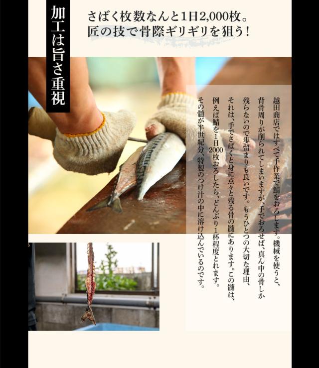 製法はいたってシンプル。 原料には大型のノルウェー鯖を使います。生原料で約600gサイズを使用(出来上がりの量目で約200g)。手作業で骨際を狙って3枚卸にし、秘伝のつけ汁にざぶん!気候にあわせて短時間陰干しにした後に冷凍します。解凍した時には、生っぽいのが特徴、酸化防止剤なども一切不使用です。