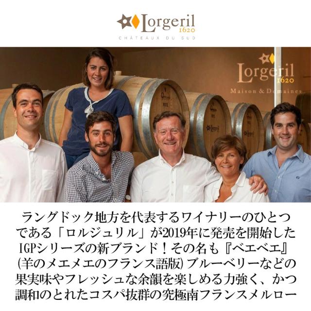 ラングドック地方を代表するワイナリーのひとつである 「ロルジュリル」が2019年に発売を開始した IGPシリーズの新ブランド! その名も『ベエベエ』 (羊のメエメエのフランス語版) ブルーベリーなどの 果実味やフレッシュな余韻を楽しめる力強く、かつ 調和のとれたコスパ抜群の究極南フランスメルロー