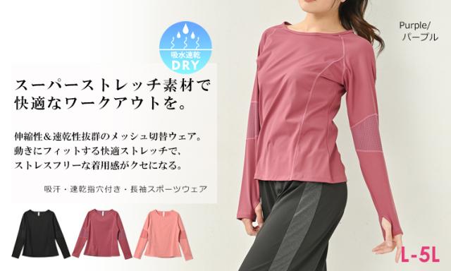 大きいサイズ レディース スポーツウェア 運動着 長袖トップス 指穴カットソー 長袖カットソー 長袖Tシャツ メッシュ切替 メッシュ素材 速乾性 ドライ 通気性 伸縮性 フィットネスウェア ジムウェア ヨガウェア おうちヨガ メッシュ ストレッチ 快適 屋内 屋外 吸汗速乾 萌え袖 ラグランTシャツ クルーネック Uネック 30代 40代 50代 春 夏 秋 冬 L LL 3L 4L 5L 13号 15号 17号 19号 黒 紫 sp-all-tp0091 plus1 plus2 トレーニングウェア