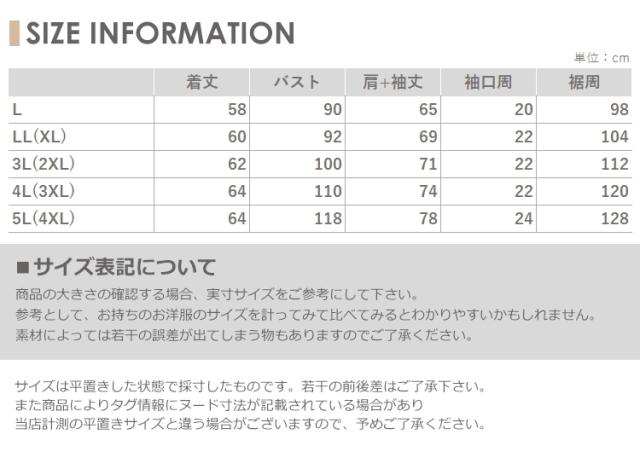 5L(4XL):着丈64 バスト118 肩+袖丈78 袖口周24 裾周128