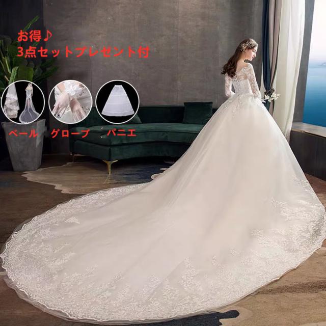 SALL レース ウェディングドレス トレーン 長袖 9分丈袖 オフショルダー 白 大きいサイズ オーダーサイズ可 3点セット付 H006b