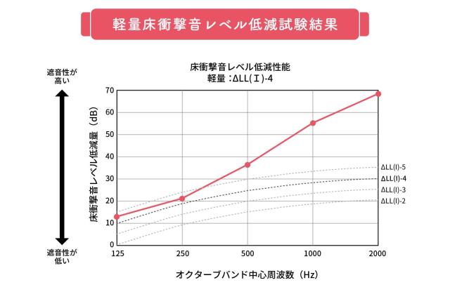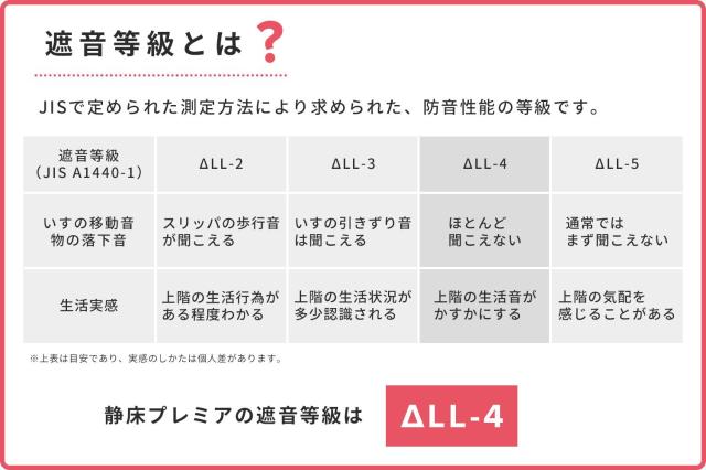 特殊なバッキング構造を採用しており、階下への騒音を防ぐ効果があります。静床プレミアはΔLL-4(スラブ厚150mm)の遮音等級を持ちます。