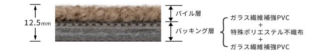 素材:(パイル)BCFポリエステル100%(バッキング)ガラス繊維補強PVC+不織布+ガラス繊維補強PVCの3層構造