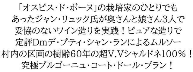 「オスピス・ド・ボーヌ」の栽培家のひとりでもあったジャン・リュック氏が奥さんと娘さん3人で妥協のないワイン造りを実践!ピュアな造りで定評Dmデ・プティ・シャン・ランによるムルソー村内の区画の樹齢60年の超V.Vシャルドネ100%!究極ブルゴーニュ・コート・ドール・ブラン!2020年!