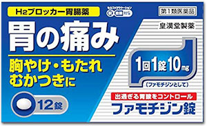 | 成分・分量 | (1錠中) 〔成 分〕:〔含 量〕:〔作 用〕 ファモチジン:10mg:過剰の胃酸の分泌を抑制します。 添加物として乳糖水和物、トウモロコシデンプン、セルロース、ヒドロキシプロピルセルロース、ヒプロメロース、マクロゴール、酸化チタン、白糖、タルク、アラビアゴム、ポビドン、カルナウバロウ、ステアリン酸マグネシウムを含有します。 |