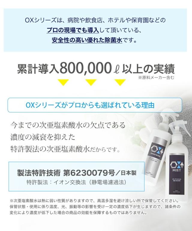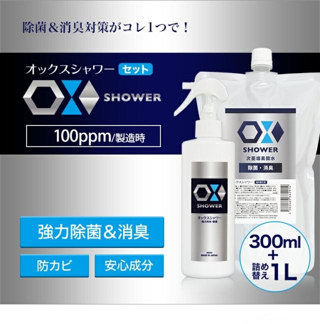 特許製法 次亜塩素酸水 OXシャワー オックスシャワー 300mlと1Lセット 除菌消臭スプレー 100ppm 日本製 次亜水 次亜塩素酸水溶液 防災