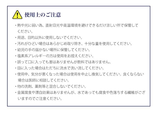 ・金属腐食や漂白効果はありませんが、水であっても腐食や色落ちする繊維がございますのでご注意ください。