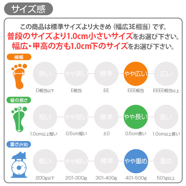 | こちらの商品は【標準サイズより大きめ(幅広3E相当)】です。 普段お履きのサイズより0.5cm小さいサイズをお選び下さい。 幅広設計なので、甲高・幅広の方も0.5cm小さいサイズをお選び下さい。 【男性スタッフ小牧(172cm) 普段のサイズは、革靴27.0cm/日本製スニーカー27.5cmです】 私のジャストサイズは27.0cmでした。靴下を履いて、ゆったりとしたフィット感のあるサイズです。 ■納期について 当商品は入金確認後、5営業日以内に発送される商品です。 あす楽など、ショッピングサイト企画の配送サービスは対象外となります。 ご了承くださいませ。 |