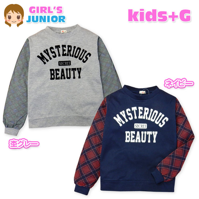 【送料無料】子供服 女の子 Tシャツ 長袖 天竺 チュール重ね袖 チェック柄 ロゴフロッキープリント 女児 ジュニア 140cm 150cm 160cm【メール便対応】