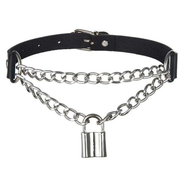ボンデージ風 南京錠ダブルチェーン フェイクレザーチョーカー ブラック 黒色 鎖 首飾り ネックレス レディース SM風 ゴシック パンク モデル コスプレ 仮装 ラリエット風 カギ 鍵 ボンテージ 面白い ロック 彼女 女性 女の子 くさり 大人 女子 女の子 2連
