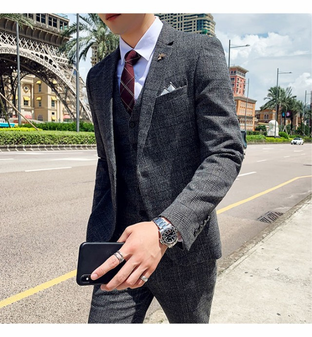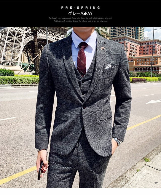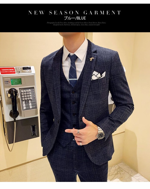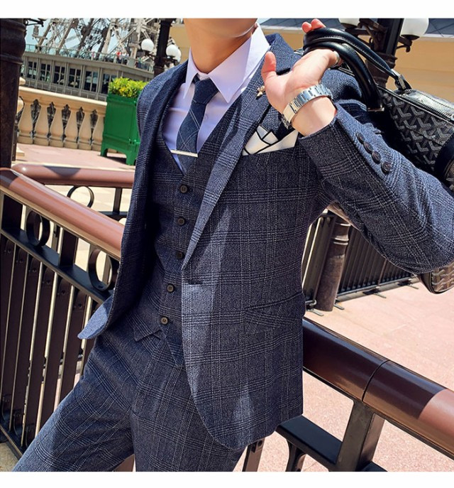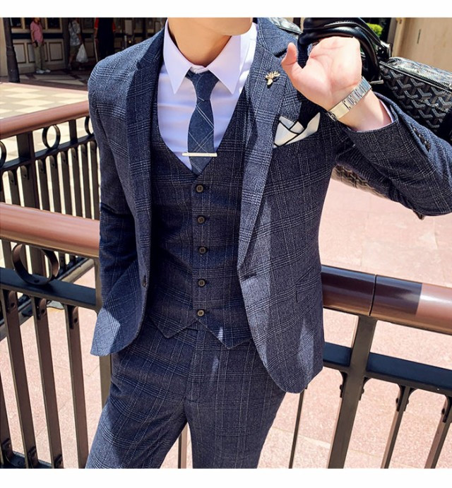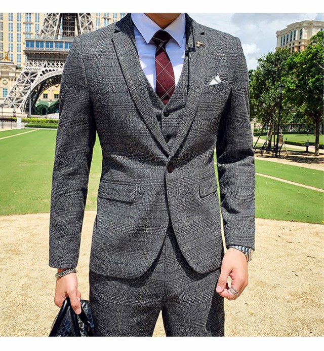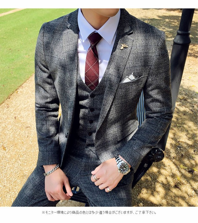 送料無料メンズ スーツ 3点セット メンズスリーピーススーツ テーラードジャケット ベスト ズボン チェック柄 ビジネススーツ 結婚式 就職