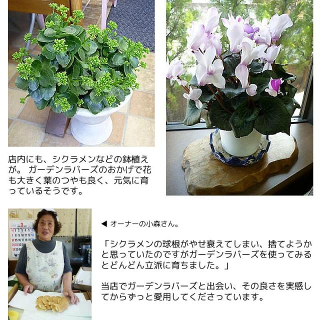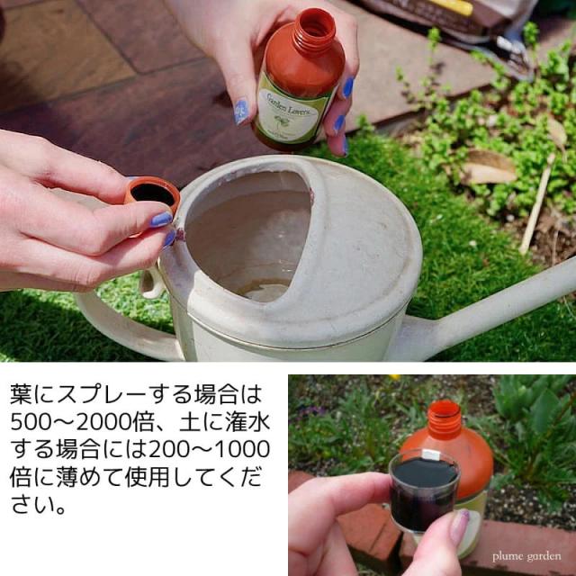 高濃度微生物特殊活性有機資材としてガーデンデザイナーやガーデナーに推奨されているほか、200〜2000倍に希釈して植物に直接スプレーできるというお手軽さもあって、当店ではNo.1のリピート率を誇っています。