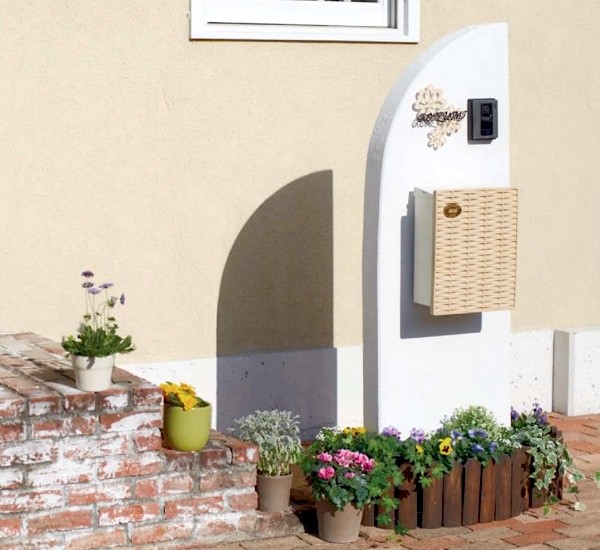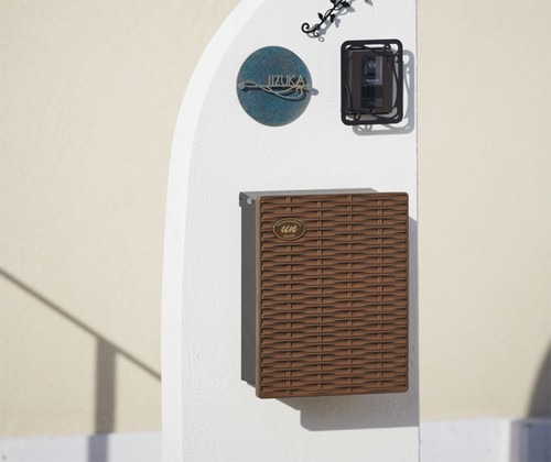 ラタンを編んだようなデザインのパネルを用いたメールボックス。