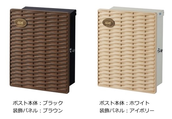 新築祝いにオススメです!ポスト 特徴■バスケットをイメージさせるかわいらしさがポイント。ラタンを編んだようなデザインのパネルを用いたメールボックス。かわいいバスケットに郵便物を届けるような、素敵な雰囲気を演出してくれます。カントリー調の洋風住宅に似合う、あたたかい風合いの郵便ポストです。ポスト本体のカラーと装飾パネルのカラーの組み合わせは変更することができます。