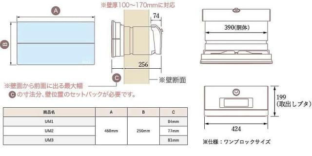 壁厚100mmから170mmに対応した、一般で言われるワンブロックサイズの仕様です。表側の寸法、出幅はタイプによって若干異なります。詳しくはポスト寸法図をご覧下さい。(図はUM1)