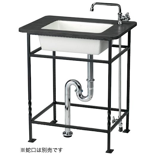 深めのシンクと木目調のテーブルトップ、掃除のしやすい排水目皿や物をかけられるロートアイアン脚部が特徴です。