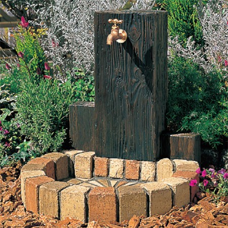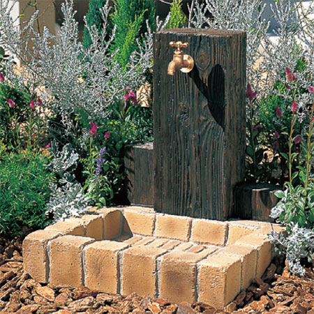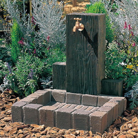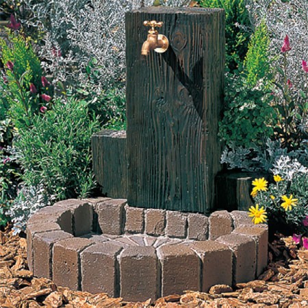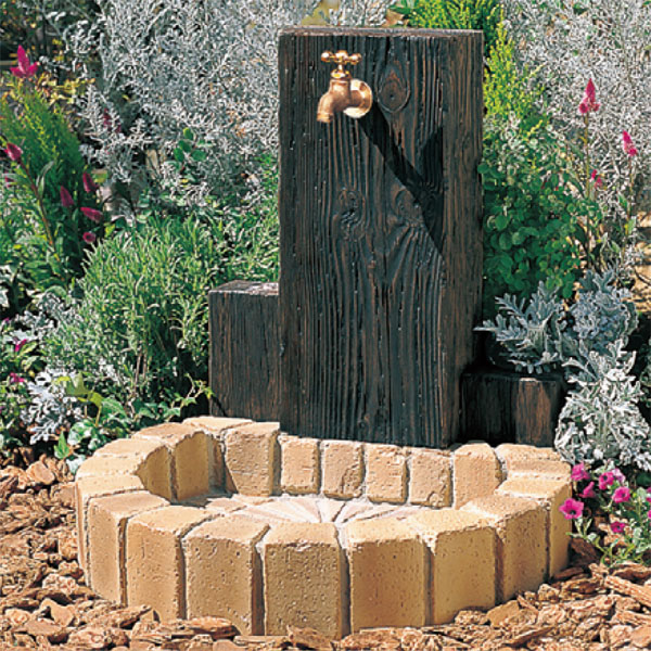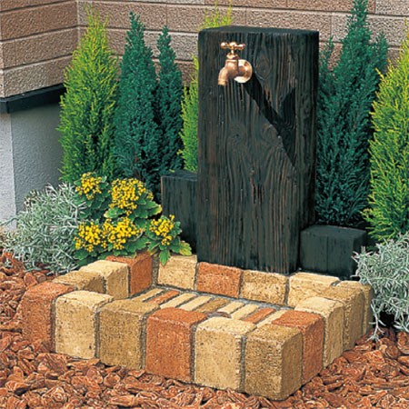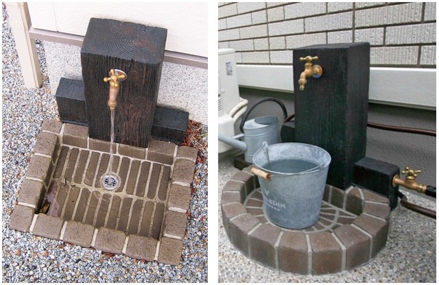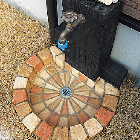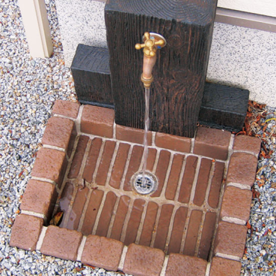 枕木から型どりした立面と、アンティークレンガ調のパンを組み合わせた、ナチュラルな立水栓ユニット。