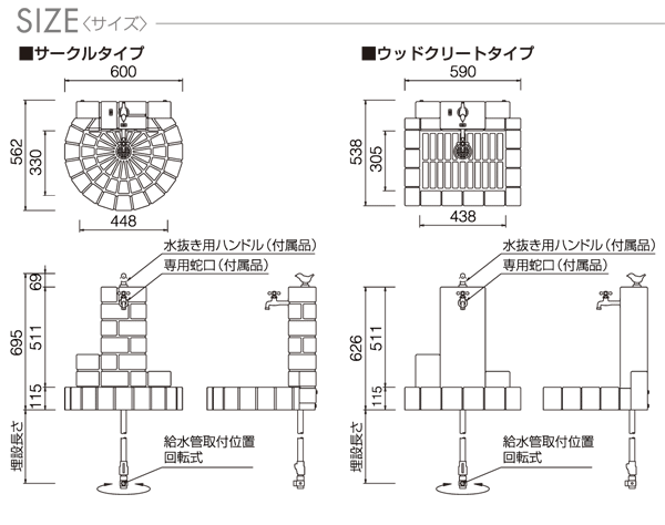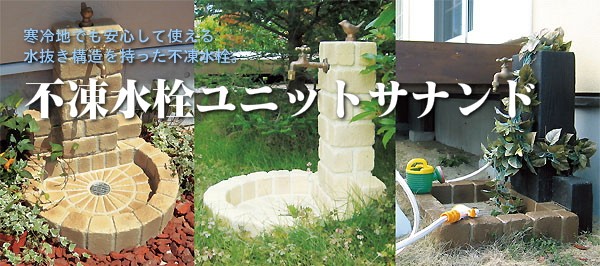 新築祝いにオススメです!立水栓の特徴ガーデンにレンガ調の水栓柱(立水洗) 寒冷地で使える外流し 水抜き構造の不凍水栓 立水栓ユニット サナンド 丸型(PA)&角型(PB) 埋設0.3m D-JX-PA-030 D-JX-PB-030(送料無料)配管内部の水を簡単に抜く事ができ、寒冷地での使用に対応した立水栓にオシャレなデザインの寒冷地用立水栓が幅広いバリエーションで勢揃いしました。※蛇口が付属しています。ほかの蛇口は使用できません。