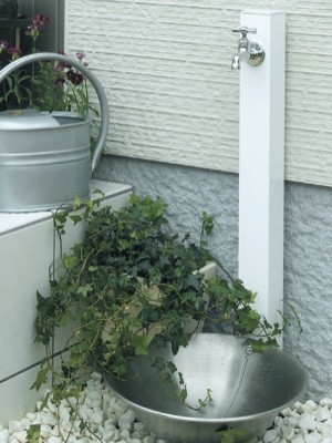 ステンレス製のシンプルなパン(水受け)。スタンドタイプの水栓柱と合わせ、ガーデン・エクステリアにお使いいただけます。