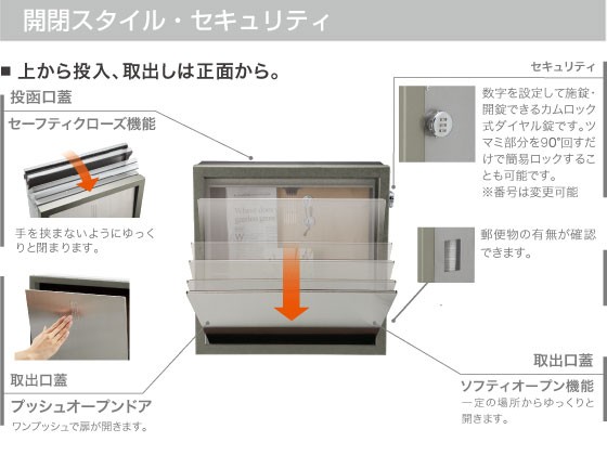 | 使用上の注意 | ・投函口、ドアの開閉の際に手など挟まないよう、ご注意下さい。 ・製品の切断面に十分ご注意下さい。安全に配慮し、処理を施してありますが、ケガをする場合があります。 ・商品は防雨型ですが、完全防水ではないため激しい風雨の場合は早めに荷物をお取り下さい。 ・ポストは壁面より手前に突き出ますので、危険の無いよう取り付け環境には十分ご注意下さい。 ・郵便物を取り出した後は必ず蓋を閉めて施錠して下さい。郵便物が過度に多い場合や重量物の場合に取出口蓋が開いてしまう場合があります。 ・仕様変更及び掲載写真について 製品の改良・改善の為、仕様は予告無く変更される場合がございますので、ご了承下さい。 ・商品写真は撮影状況、各パソコンでの表示の関係上、実際の色、材質感とは、異なる場合がございますのでご了承下さい。 |