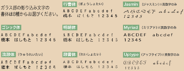 ●ガラス部の彫込文字の書体は8種類からお選びください。