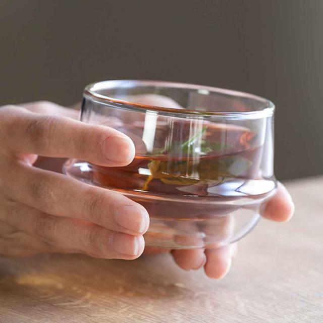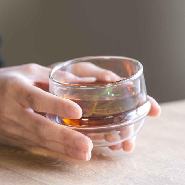 ころんと丸いフォルムが魅力のダブルウォールグラスです。耐熱ガラス製なので、温かい飲み物も、冷たい飲み物も入れることができます。コップを選ぶ時にグラスやマグカップなど飲み物によって分けがちですが、このグラスはどんなドリンクでも美しく見せてくれるのでコップを選ぶ時間や、洗い物も減らせます。食器のミニマル化にも貢献してくれそうです。