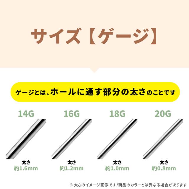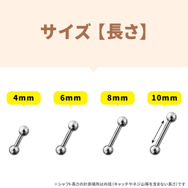 太さ14G,16G,18G,20G シャフト長さ4mm〜10mm ボールサイズ3mm〜5mmのストレートバーベルです。