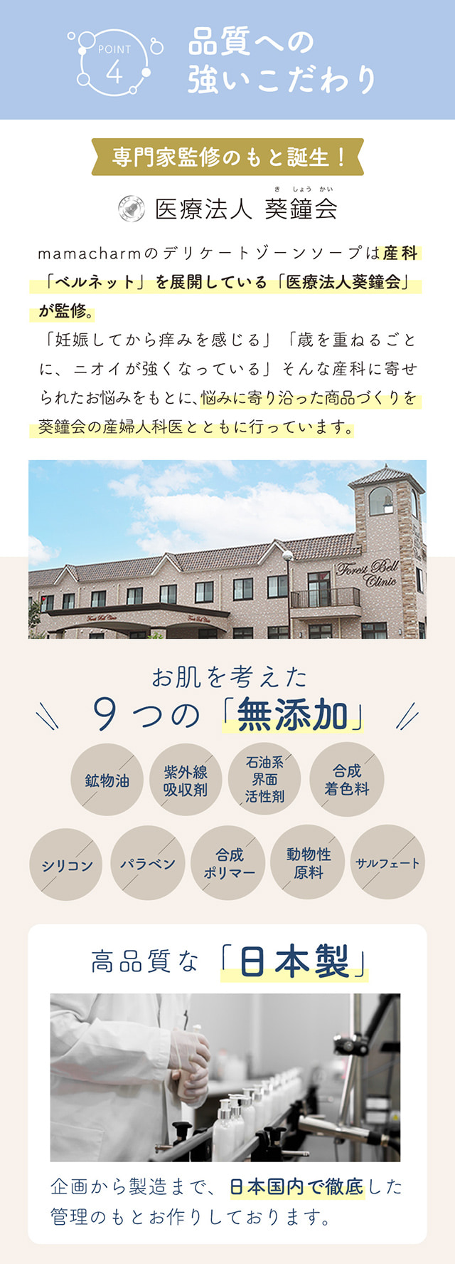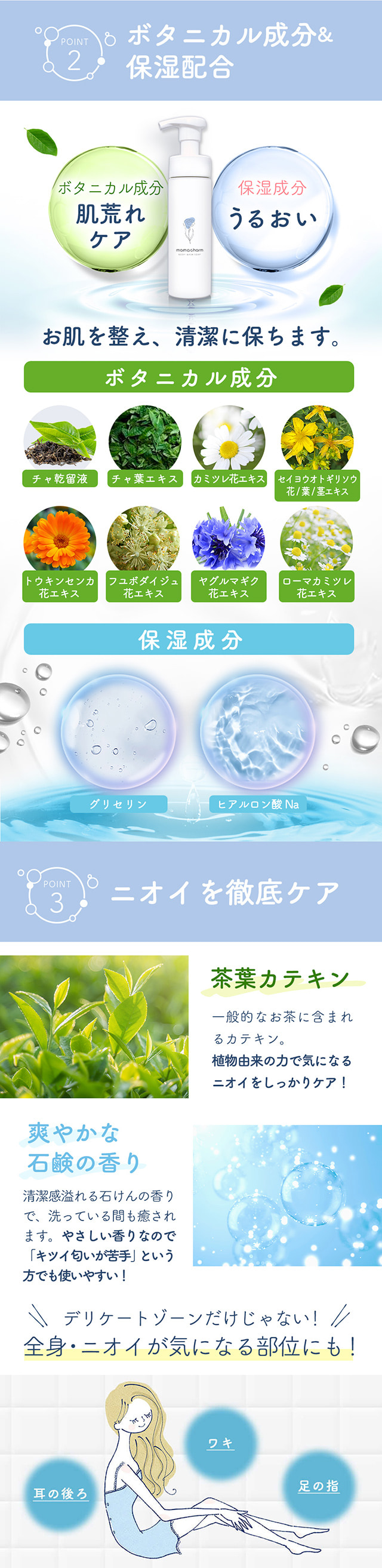 | 商品特徴 | 妊婦さん&ママ向けデリケートゾーン専用泡タイプソープ。 妊娠中の気になるムレやニオイ・かゆみに着目。 泡タイプだから泡立てる手間不要! 柔らかく洗い上げることで摩擦を防ぎます。 |