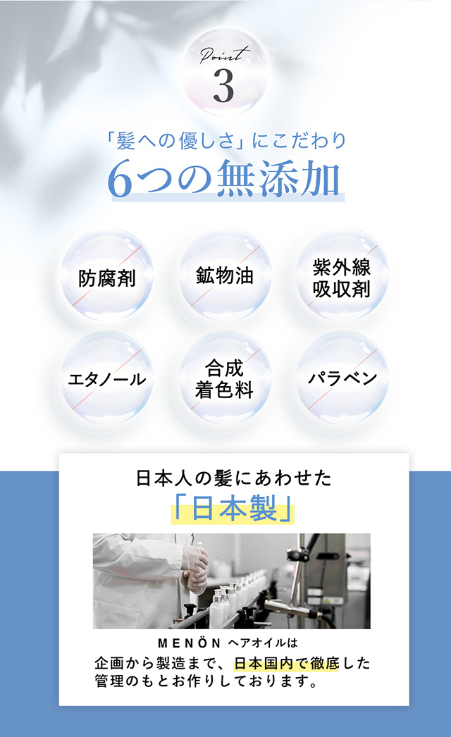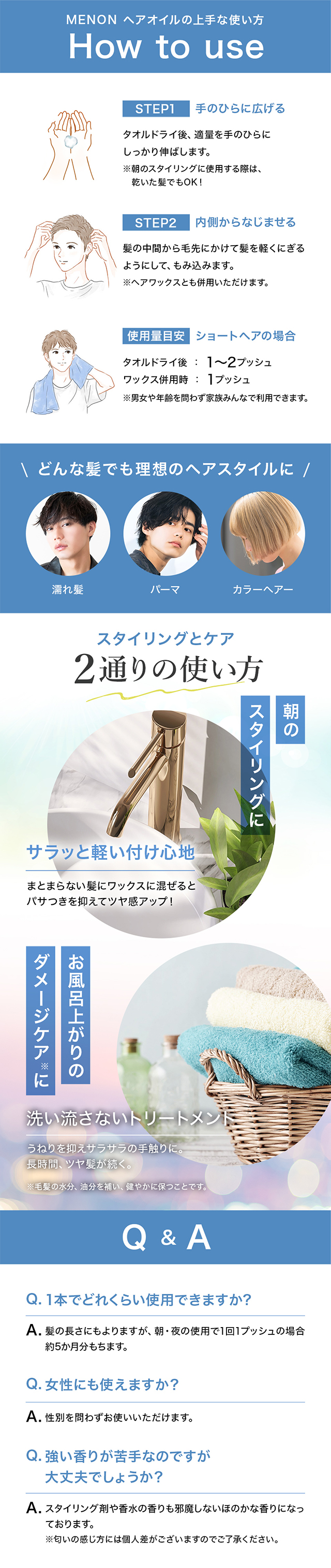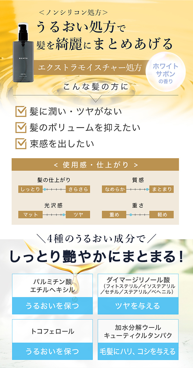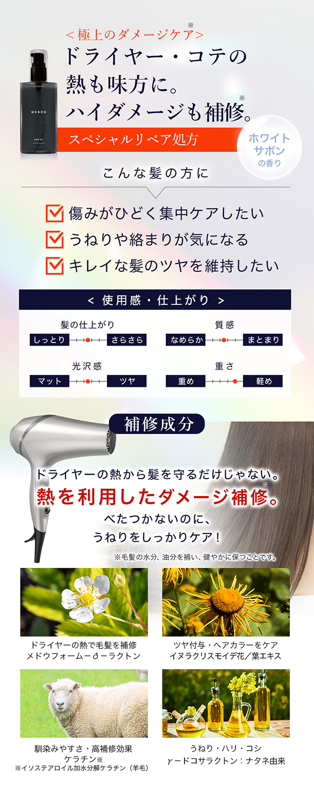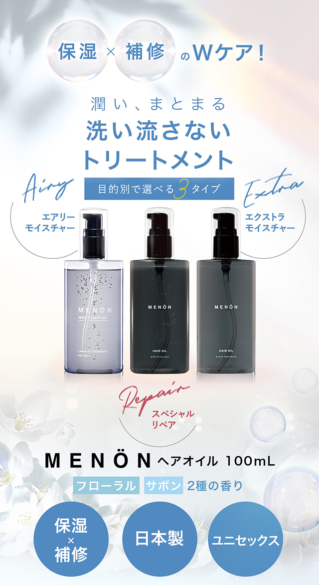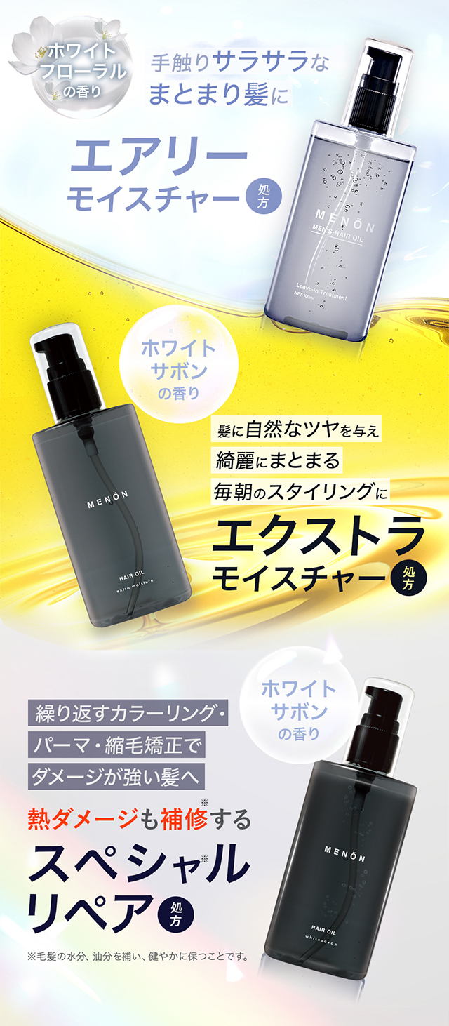 | 商品特徴 | 【クセ毛が気になる方へ】髪のパサ付きや広がりを抑え、朝のセット・スタイリングがしやすい理想な髪質に導くMENONヘアオイル。洗い流さないヘアトリートメントとして、お風呂上りのドライヤー前などにご使用ください。 |