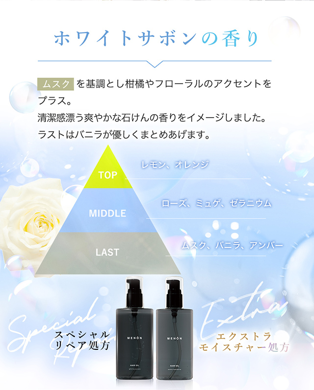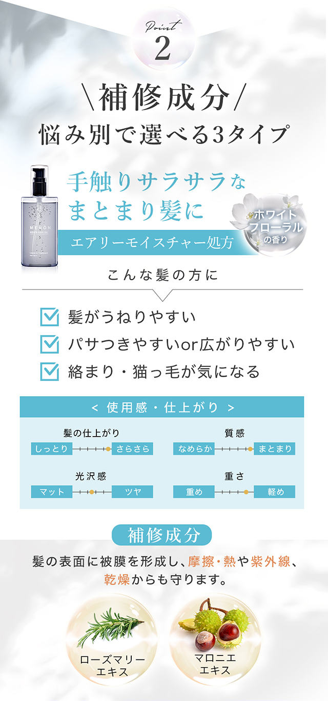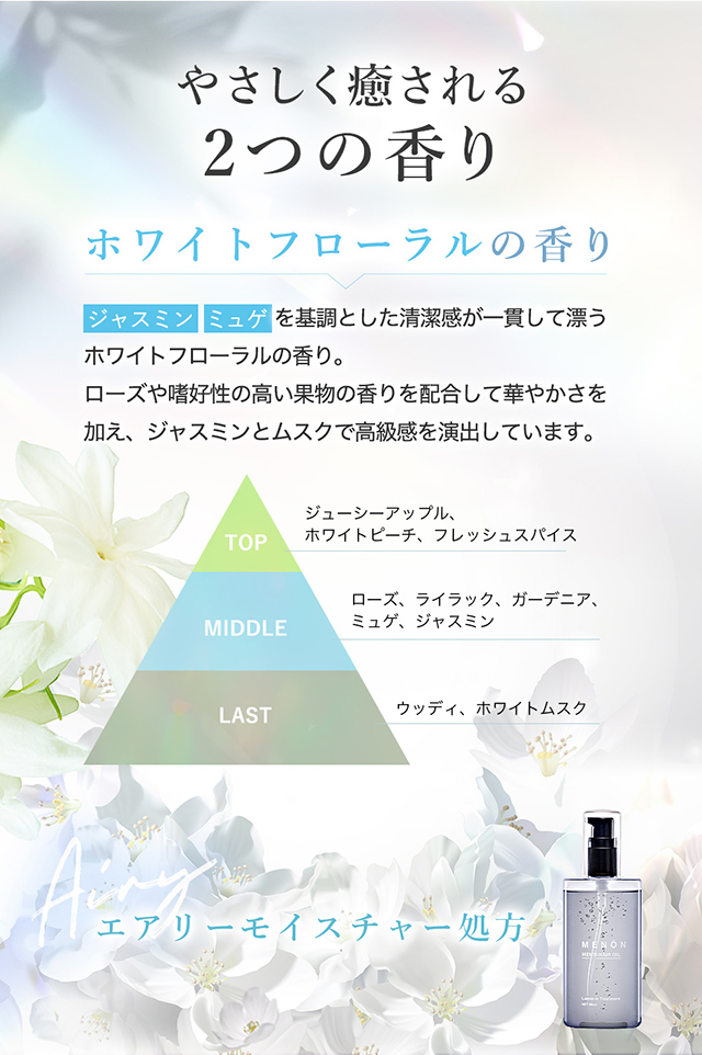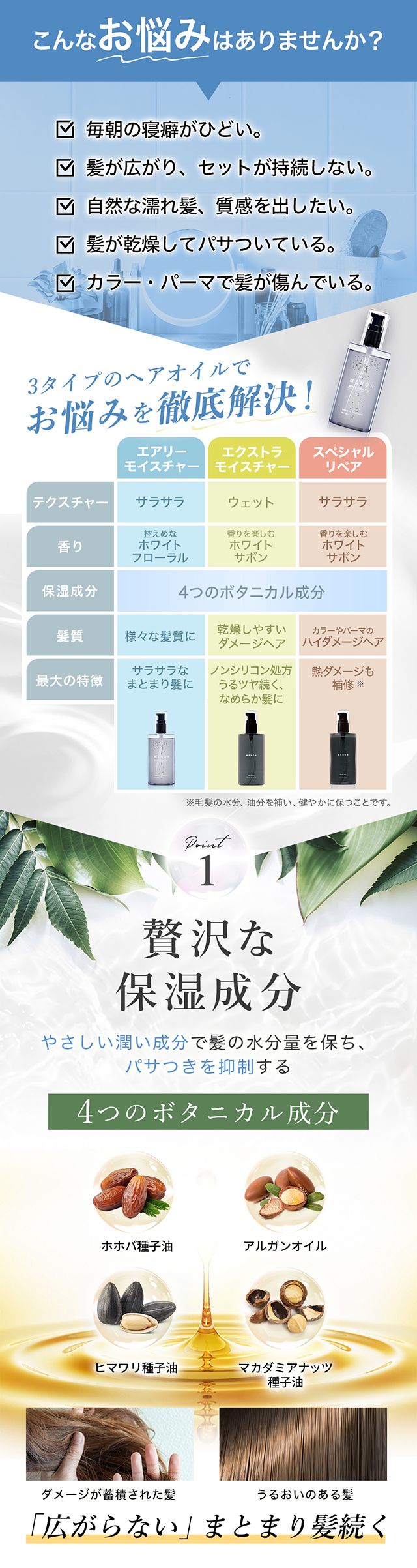 | 成分 | 【エアリーモイスチャー処方(ホワイトフローラルの香り)】シクロペンタシロキサン、ジメチコノール、ジメチコン、パルミチン酸エチルヘキシル、ホホバ種子油、マカデミア種子油、ローズヒップ油、ブドウ種子油、アルガニアスピノサ核油、マロニエエキス、ローズマリー葉エキス、ヒマワリ種子油、香料 【スペシャルリペア処方(ホワイトサボンの香り)】シクロペンタシロキサン、ジメチコン、香料、ジメチコノール、トリ(カプリル酸/カプリン酸)グリセリル、ラウロイルグルタミン酸ジ(フィトステリル/オクチルドデシル)、ホホバ種子油、ブドウ種子油、ヒマワリ種子油、アルガニアスピノサ核油、マカデミア種子油、メドウフォーム?δ?ラクトン、シクロヘキサン?1,4?ジカルボン酸ビスエトキシジグリコール、カニナバラ果実油、イソノナン酸イソノニル、イソステアロイル加水分解ケラチン(羊毛)、イヌラクリスモイデ花/葉エキス、γ?ドコサラクトン、トコフェロール 【エクストラモイスチャー処方(ホワイトサボンの香り)】パルミチン酸エチルヘキシル、ダイマージリノール酸(フィトステリル/イソステアリル/セチル/ステアリル/ベヘニル)、ホホバ種子油、香料、トコフェロール、ヒマワリ種子油、マカデミア種子油、アルガニアスピノサ核油、水、イソノナン酸イソノニル、イソステアロイル加水分解ケラチン(羊毛)、加水分解ケラチン(羊毛)、ペンチレングリコール |