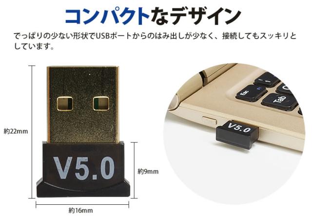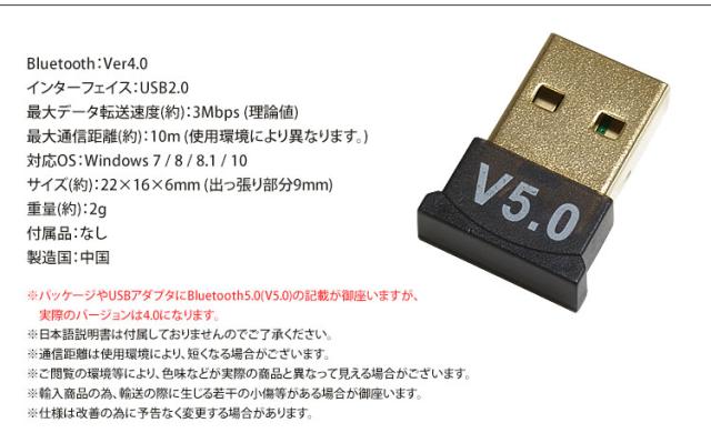 ※パッケージやUSBアダプタにBluetooth5.0(V5.0)の記載が御座いますが、実際のバージョンは4.0になります。