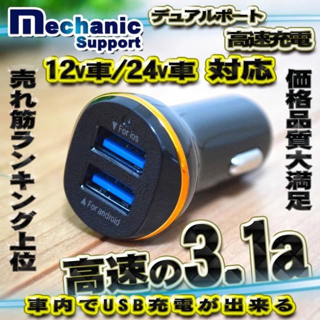 メカニックサポート 高速 2ポート 3.1a USB 充電器アダプター シガーソケット 12/24v対応 ブラック