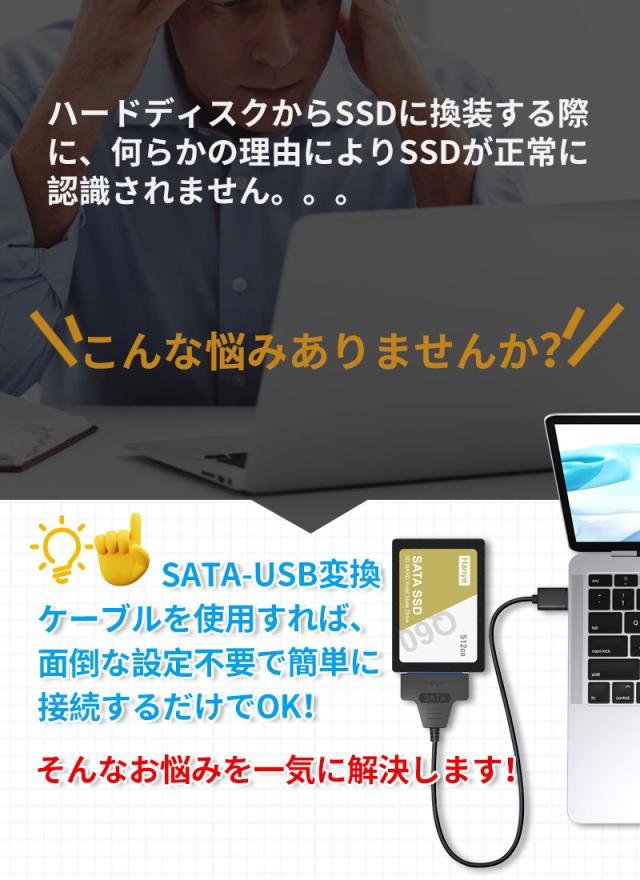 動作状況が一目で分かる赤・青ランプが付き。 接続時:赤・青ランプが同時に点灯する; データ移行中:赤ランプが点灯し、青ランプが点滅する。 長さ:50cm 2.5インチのSATAハードデイスクやSSDをUSB3.0接続ハードディスクに変換できるケーブルです。高純度銅芯線を採用、ニッケルメッキが施され、信号伝送による減衰を減少し、安定性も大幅に向上します。従来のUSB端子より丈夫な構造で挿抜回数は千回以上に耐えられるように設計されています。ドライバのインストールが不要、ホットスワップサポートします。SATA / SATA2.0 / SATA3.0のインタフェース対応できます。SATA端子に接続するだけで簡単に接続できるので便利です。内蔵HDDを外付けUSBストレージとして簡単に使えます。お使いのPCへのデータのお引越しなどに接続して、ハードディスクにストレージした映画を大画面で楽しむことが可能です。Windows10/8/ 7/ Vista / XP、Mac OS 9 / 10、 Linuxなどの環境に対応しております。 ハードディスクからSSDに換装する際に、何らかの理由によりSSDへの認識に失敗する。。。こんな悩みありませんか? SATA-USB変換ケーブルを使用すれば、面倒な設定不要で簡単に接続するだけでOK!そんなお悩みを一気に解決します! ※ 3.5インチのHDDは対応しておりません。 ※本製品にはハードディスクは付属していません。 ※本製品に取り付けたハードディスクはいかなる原因においても内部データおよびハードディスクの保証はいたしません。 ※製品の性質上、全ての環境、組み合わせでの動作を保証するものではありません。 ※IDEコネクタには対応しません。 ※ノートPCと接続していた場合、USBポートの輸出電力によって、認識ができない可能性があります。 |