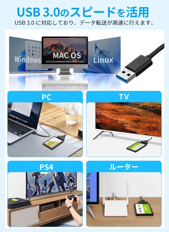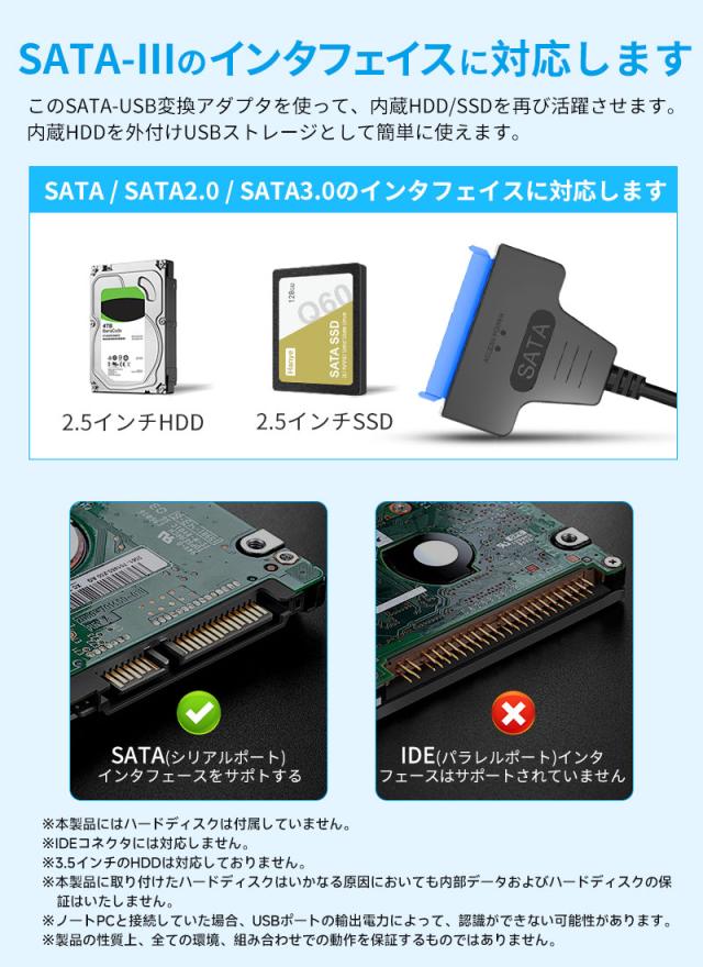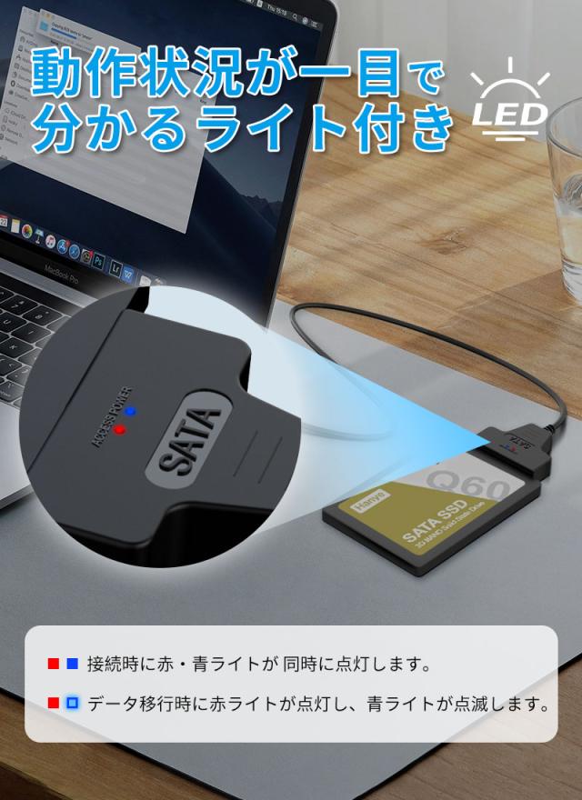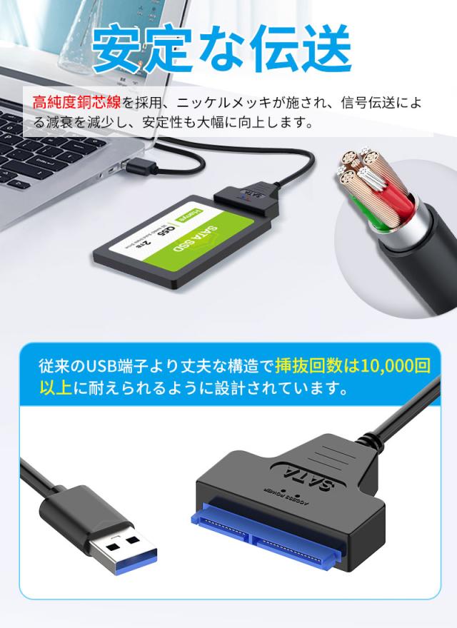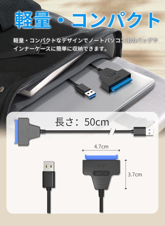 2.5インチのSATAハードデイスクやSSDをUSB3.0接続ハードディスクに変換できるケーブルです。高純度銅芯線を採用、ニッケルメッキが施され、信号伝送による減衰を減少し、安定性も大幅に向上します。ドライバのインストールが不要、ホットスワップサポートします。SATA / SATA2.0 / SATA3.0のインタフェース対応できます。Windows10/8/ 7/ Vista / XP、Mac OS 9 / 10、 Linuxなどの環境に対応しております。