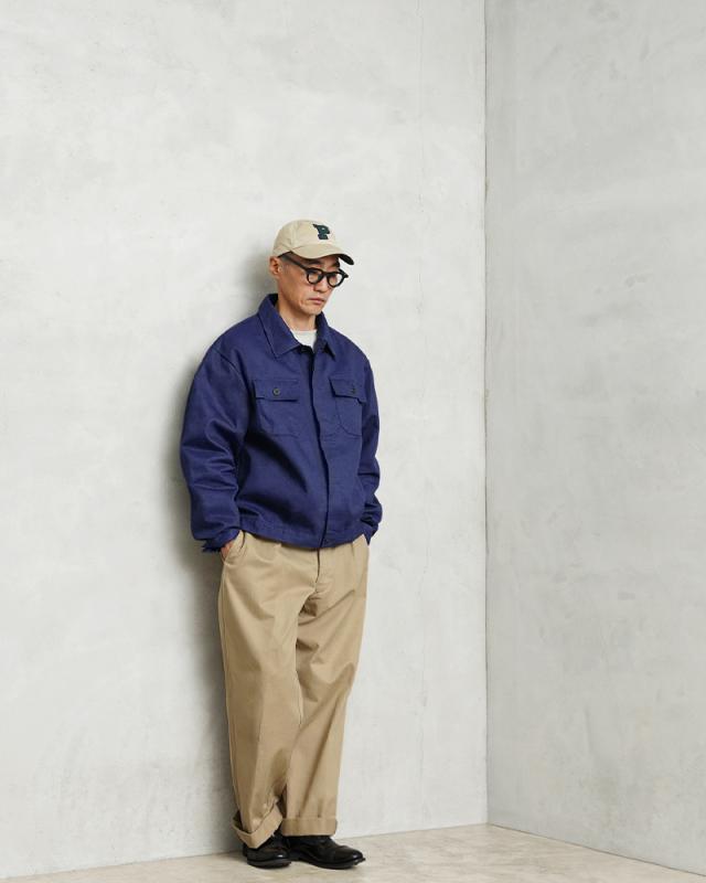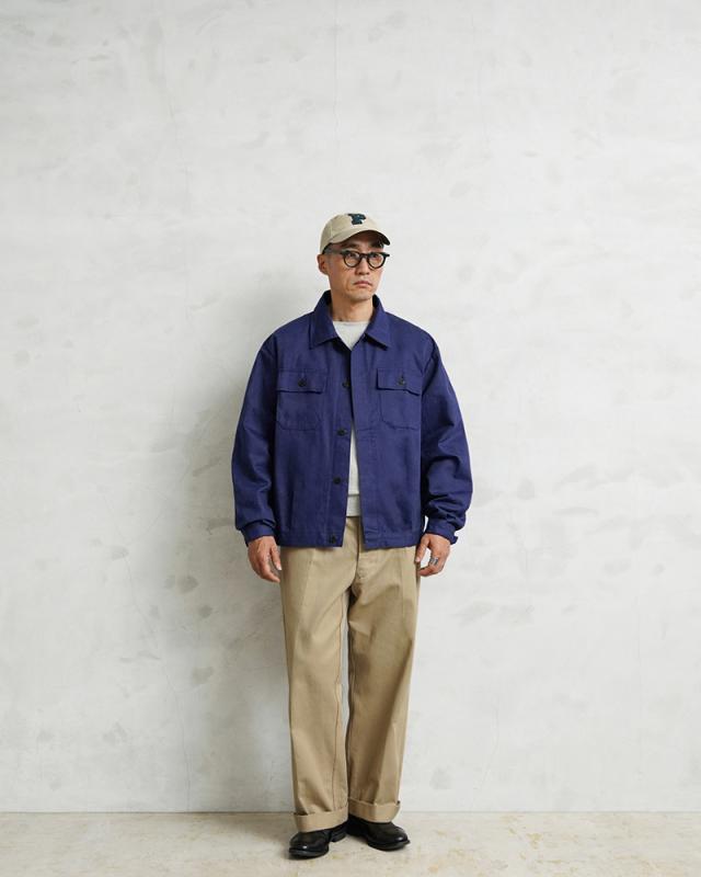 前立てがボタン留めのフライフロント(比翼仕立て)で、中心部分のボタンが露出しないようにしたデザインが引っかかりを防ぎ、防寒効果の高い仕立てですっきりとした着こなしができる1枚です。素材にはワークウエアらしいタフなコットンツイル生地を使用。程よい厚みでしっかりとした生地感は、長く着用していくことで柔らかくなり体にフィットするような心地よさが増し、経年変化によってうまれる独特な風合いもお楽しみいただけます。フロントに配置された2つのフラップ付きポケットや、起毛した肌触りのよい裏地などワークウェアの頑丈さとミリタリーウェアの実用性が融合されています。