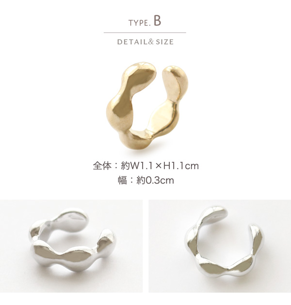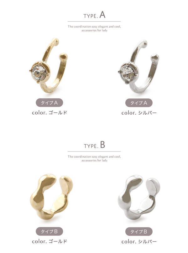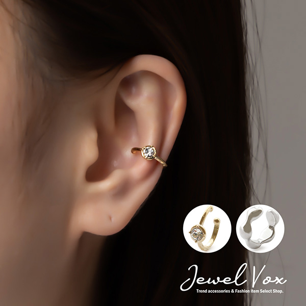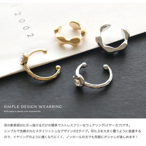 | 耳の軟骨部分に引っ掛けるだけの簡単でストレスフリーなウェアリング(イヤーカフ)です。 シンプルで洗練されたスタイリッシュなデザインの2タイプ。 耳たぶを大きく覆うように装着するので、イヤリングのように痛くなりにくく、ノンホールの方でも気軽にオシャレが楽しめます! | |