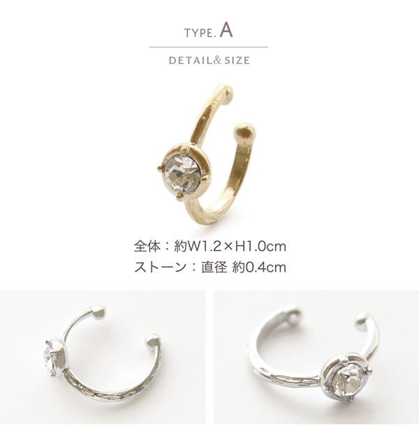 | サイズ | 【Aタイプサイズ】 全体:約W1.2×H1.0cm ストーン:直径 約0.4cm 【Bタイプサイズ】 全体:約W1.1×H1.1cm 幅:約0.3cm |