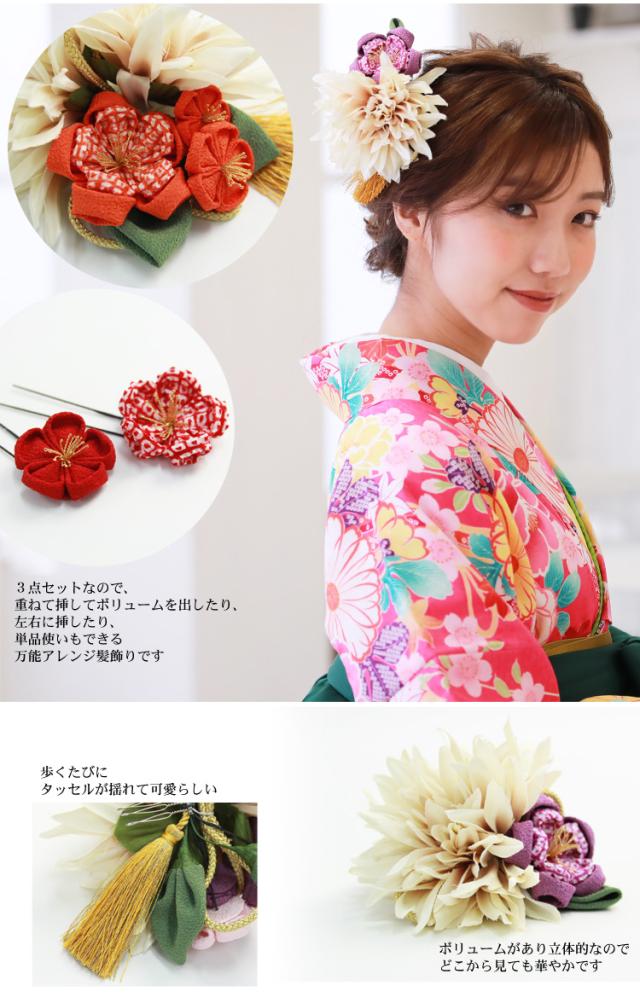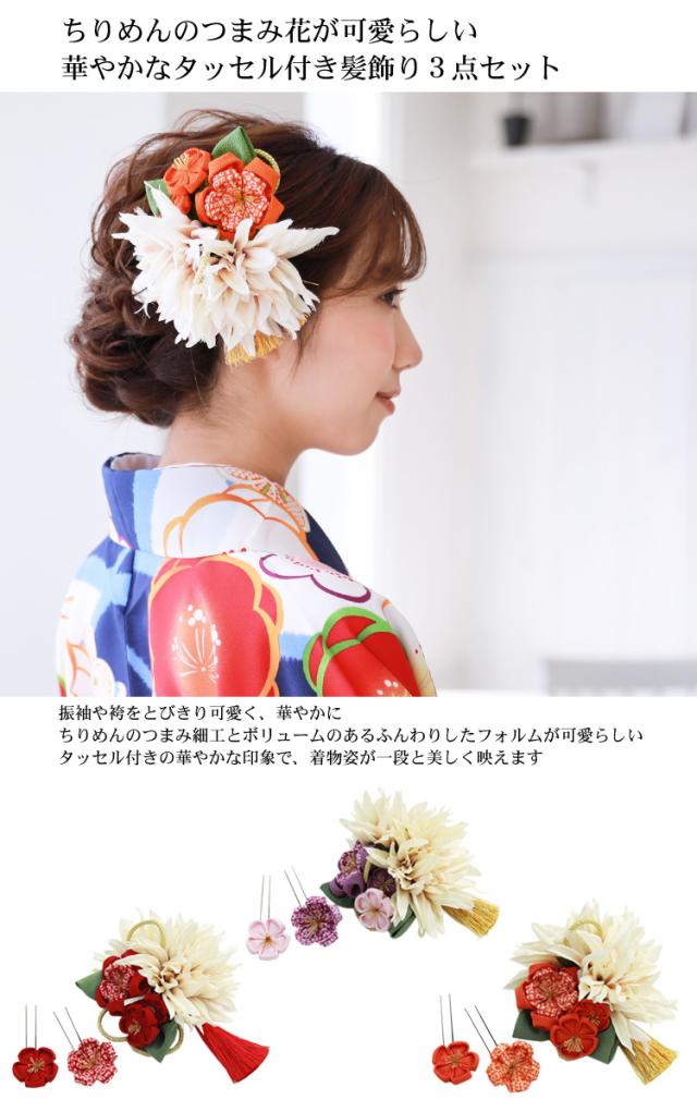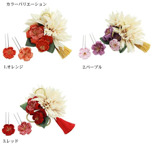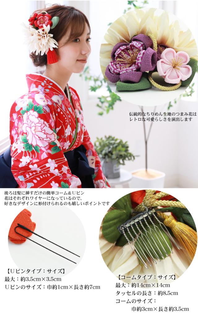 タッセル付き ちりめんつまみ花髪飾り3点セット 卒業式 袴 成人式 結婚式 振袖 コーム Uピン コサージュ ヘアアクセサリー 花 和装 レトロ ブライダル ピンク 赤 黄色 紫 緑