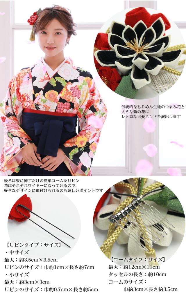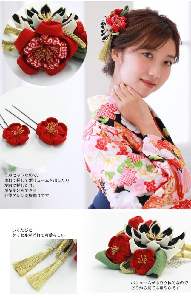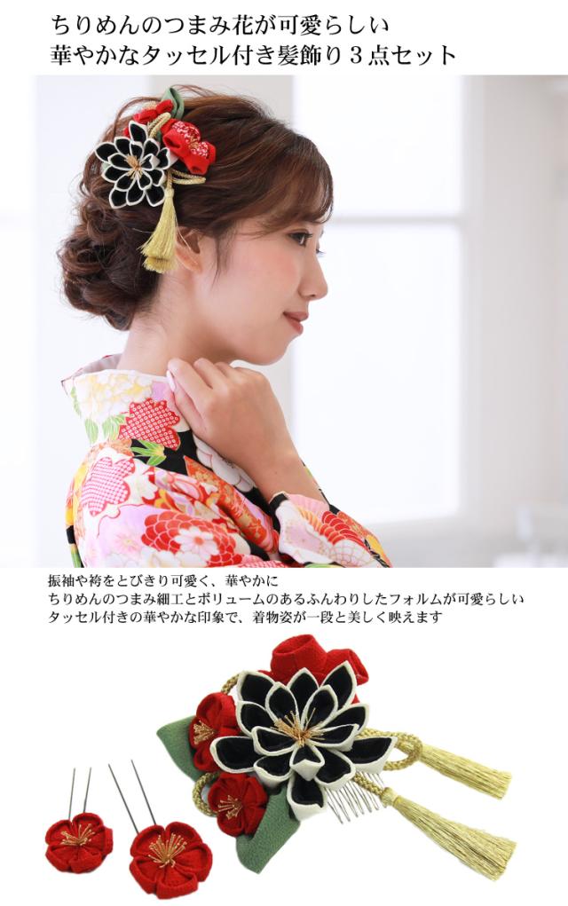 タッセル付き ちりめんつまみ花髪飾り3点セット 卒業式 袴 成人式 結婚式 振袖 コーム Uピン コサージュ ヘアアクセサリー 花 和装 レトロ ブライダル 赤 白 黒