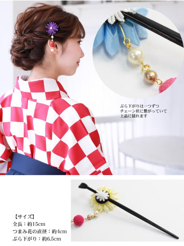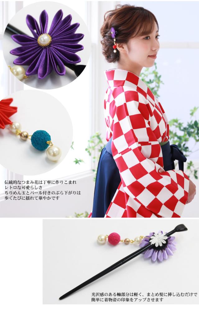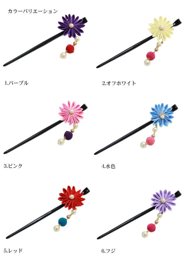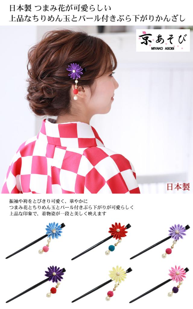 京あそび 日本製 ちりめん玉とパール付きぶら下がりかんざし 卒業式 袴 成人式 結婚式 振袖 かんざし 一本 簪 ヘアアクセサリー 花 和装 レトロ パール ブライダル 和 髪飾り 紫 白 ピンク 水色 赤 黒 MIYAKO ASOBI